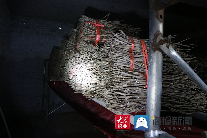 随后,刘忠义带记者参观他的养殖基地,并为记者讲起金蝉的一生。“爬叉好吃,但养殖起来不容易,生长周期比较长,从幼虫到金蝉,要两年呢。每年8月,金蝉会在比较嫩的枝条上产卵,有了蝉卵的枝条一般都会枯萎,需要人工一根一根将其收集起来。”刘忠义边说边将记者带到幼虫孵化大棚里,只见一捆捆三四十厘米左右的枝条被摞在架子上,架子下面铺了一块红布,用来接住孵化的幼虫。已经孵化的幼虫密密麻麻聚集在红布上,之后就会被养殖户收走。